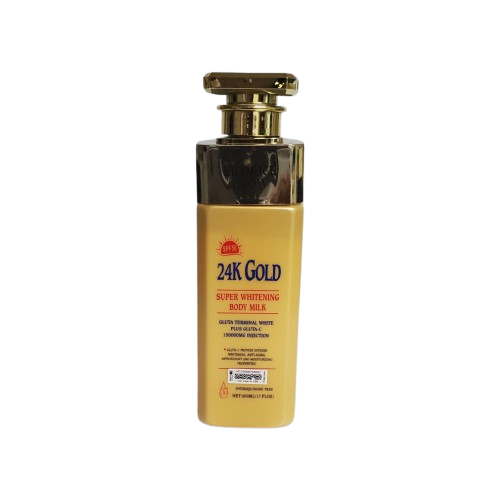 Indulge in luxury skincare with the **24K Gold Super brightening Body Milk**, a rich, fast-absorbing lotion designed to brighten, hydrate, and protect. Infused with *Glutathione*, *Kojic Acid*, and real