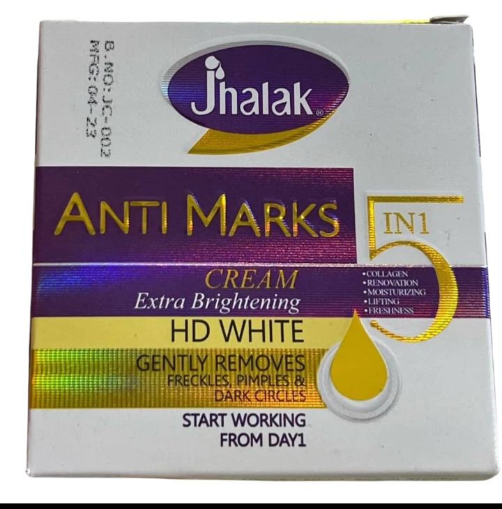 Jhalak Anti Marks Extra Brightening HD White Face Cream is a skincare product designed to moisturize, lighten, and even out the skin by targeting dark spots, acne scars, hyperpigmentation, and freckles to achieve a brighter, more radiant, and youthful complexion. Key ingredients like 24K gold and collagen help to nourish...
